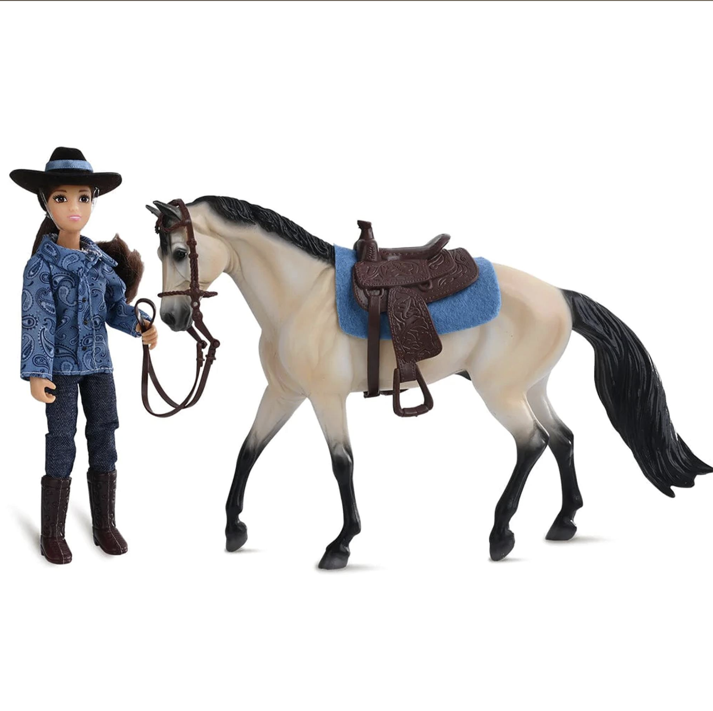 Whether riding the trails or working on the ranch, this Western rider and her trusty buckskin steed are ready for any adventure together! Includes 6″ articulated rider, horse, saddle pad, Western saddle, and bridle.