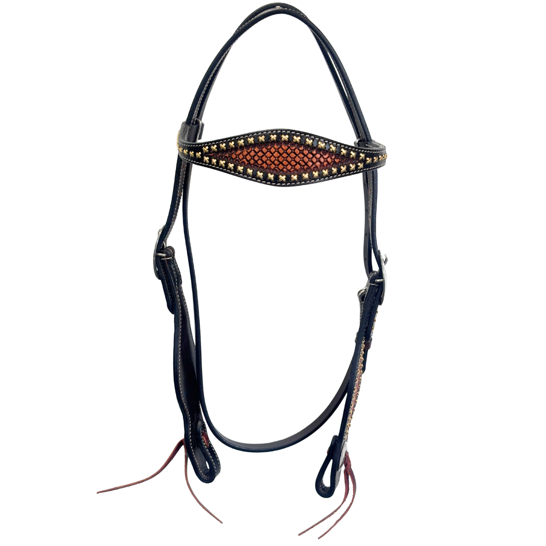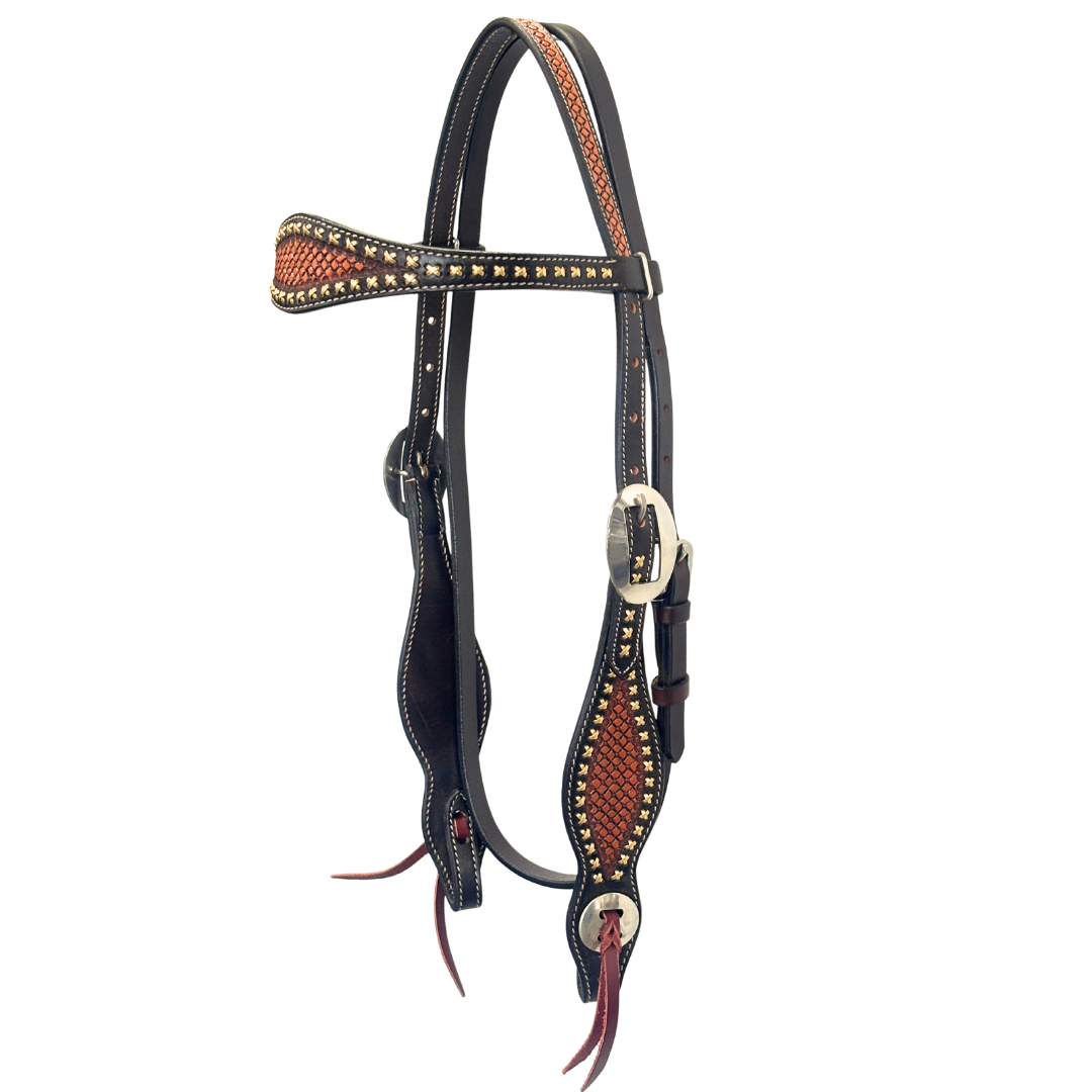 Shaped browband and cheek pieces with hand-tooled leather decoration