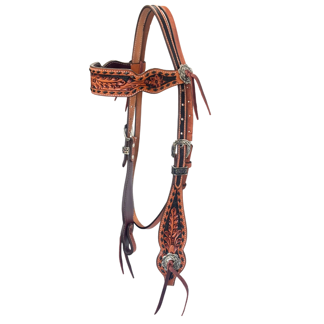 Tooled, shaped browband and cheek pieces with buckstitch decoration