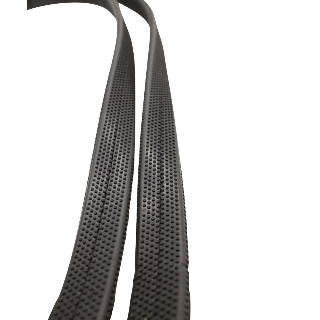 These PVC exercise reins are made from woven webbing, covered with a co-polymer, making them strong yet easy to maintain. This material retains flexibility over a large temperature range.