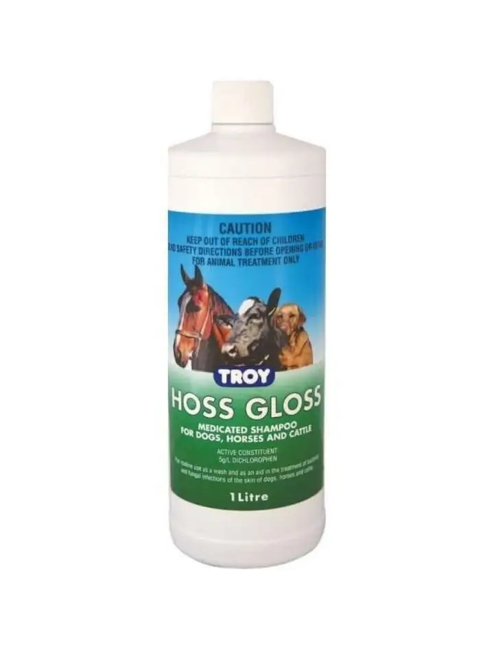 Troy Hoss Gloss Shampoo is a medicated shampoo for show horses and cattle that not only cleans their coat, but also treats bacterial and fungal infections of the skin. Can be used routinely as a shampoo.