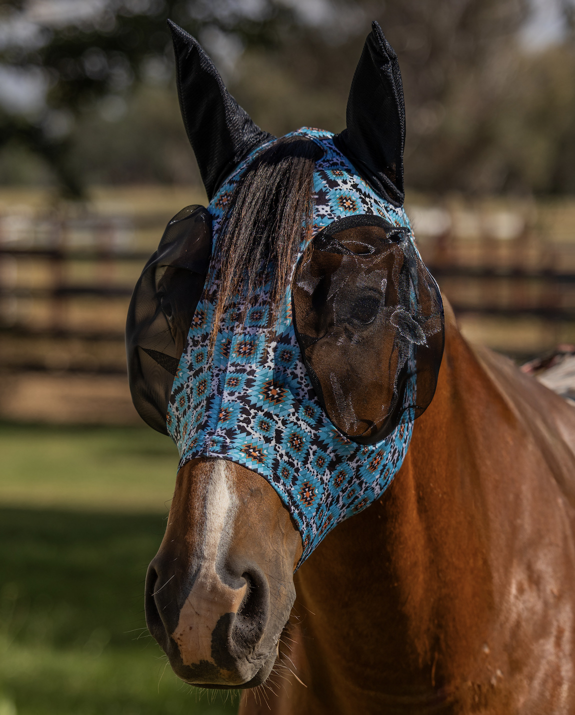 Newmarket Stretch Bug Eye Fly Mask With Ears – Aztec Cow Print