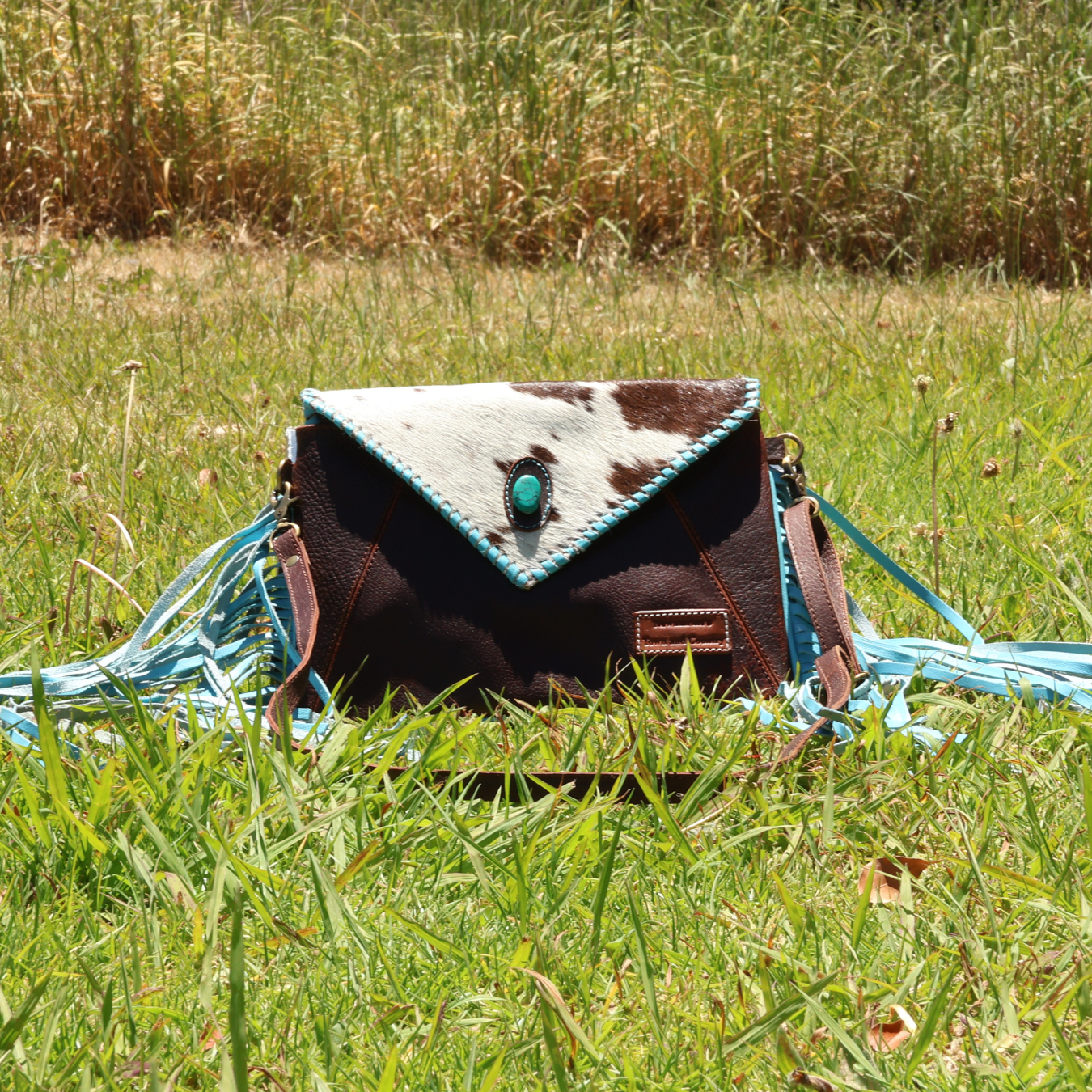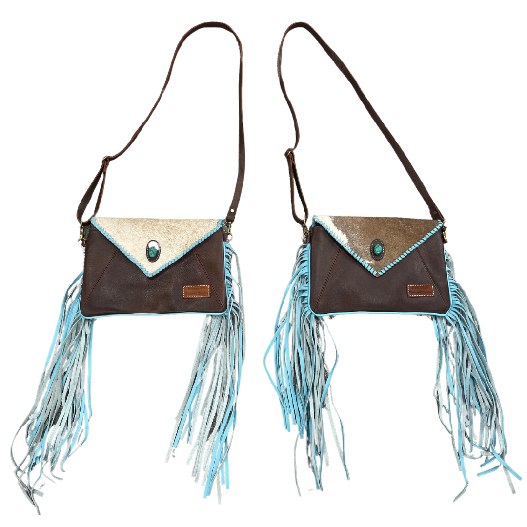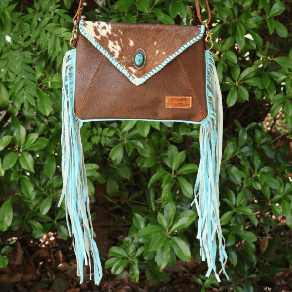 The Newmarket Turquoise Fringe Bag Bag is made from high quality leather and cowhide. Convertible crossbody clutch with leather shoulder strap