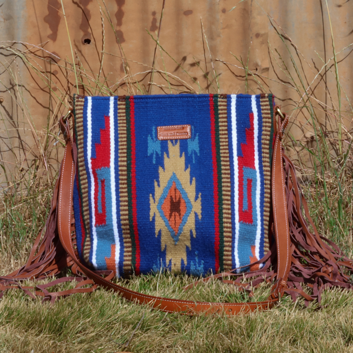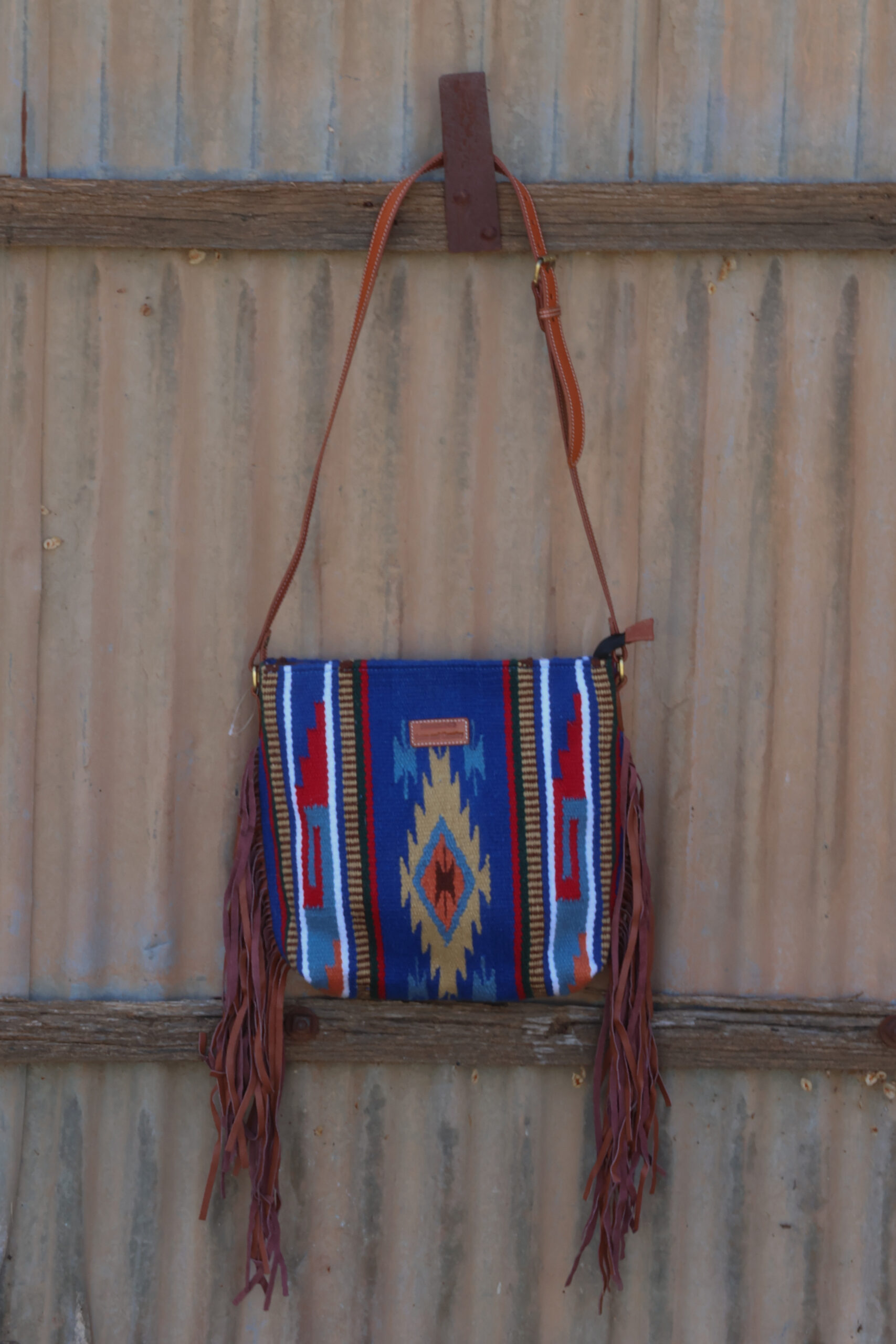 A stylish cross body or shoulder bag with tassels features wool tapestry woven in a Navajo pattern. Soft Italian leather adjustable strap, cotton-lined interior with internal storage compartments, and YKK zip closures. The internal storage pockets are perfect to store tiny belongings in an organized manner.