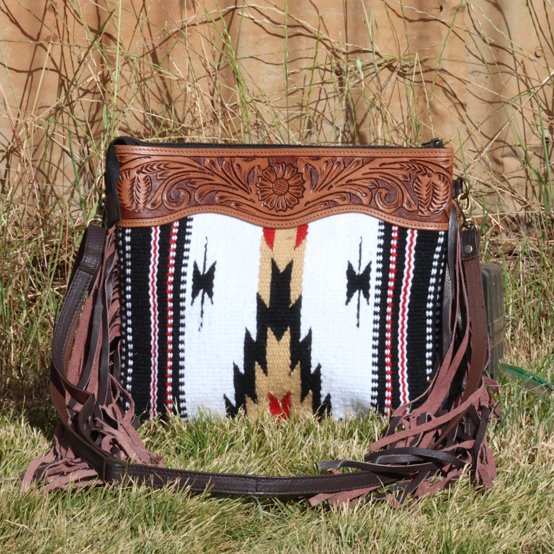 The Savannah is a high quality Navajo crossbody that features a leather shoulder strap, one main compartment, one zippered compartment and a pocket and a zip closure.