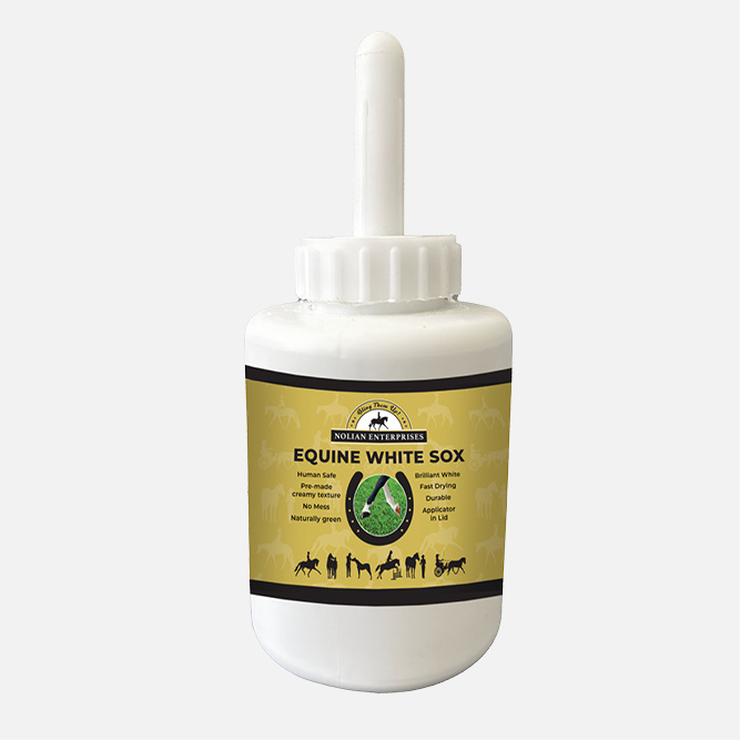 Equine White Sox – is a cosmetic grade, pre-made creamy textured formula which leaves a brilliant white finish for days and dries rapidly. No more mess or overnight waiting periods. Comes with a convenient applicator in the lid for effortless use.