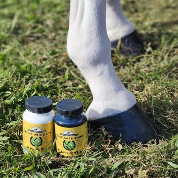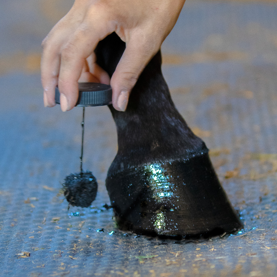 - Apply a THIN, SINGLE LAYER to the hoof (product resembles a nail polish and is slightly thicker for extra durability) and allow to dry for approximately 60 seconds. (A white hoof may require a second coat to completely cover). To seal, push down on lid and turn clockwise.