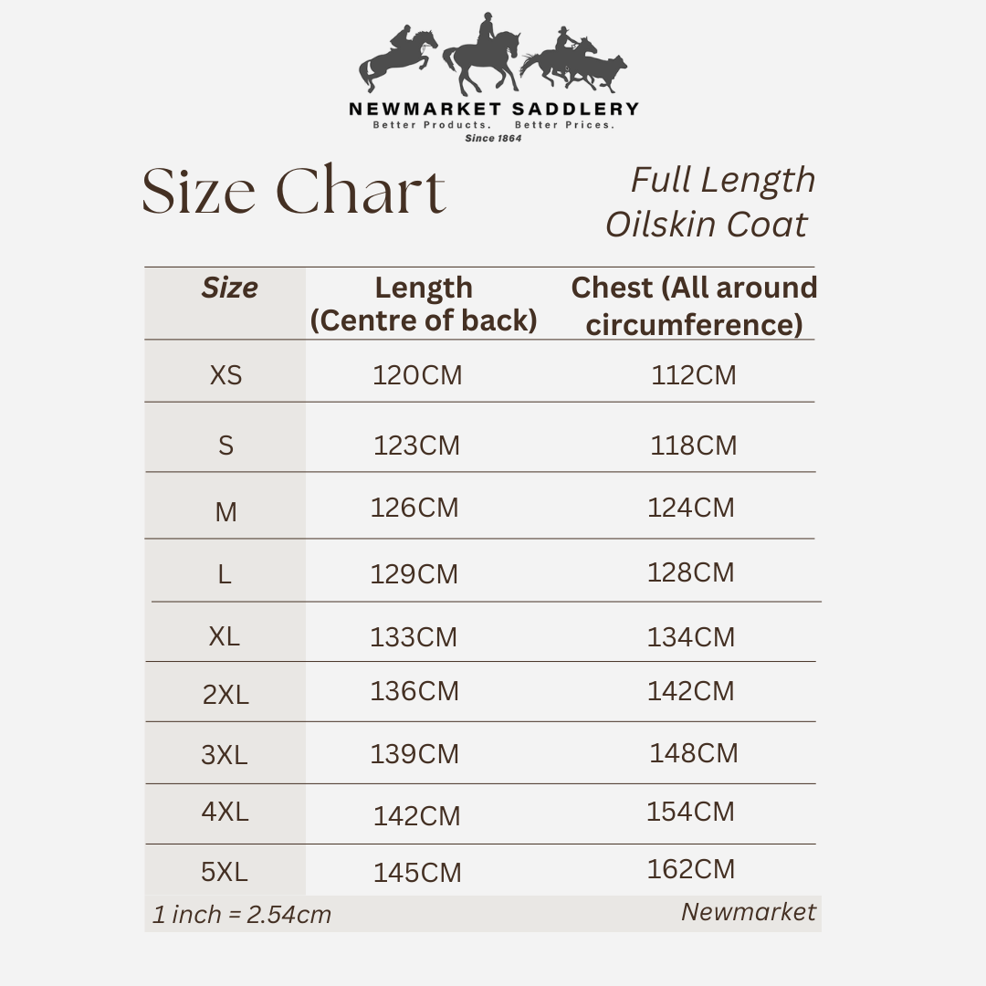Traditional style oilskin coat with cape for excellent protection. Features cotton lining, rear riding vent to comfortably fit over saddle, double front stud closure.